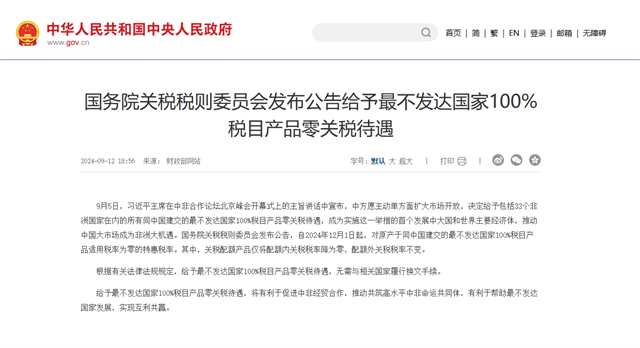 根據(jù)《國(guó)務(wù)院關(guān)稅稅則委員會(huì)關(guān)于給予最不發(fā)達(dá)國(guó)家100%稅目產(chǎn)品零關(guān)稅待遇的公告》(稅委會(huì)公告2024年第9號(hào)),