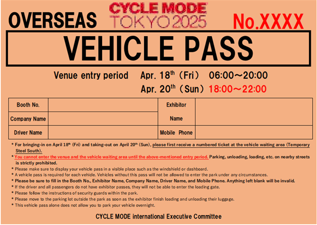 2、布/撤展車(chē)證 Vehicle Pass須填寫(xiě)展會(huì)號(hào)、參展企業(yè)名字、司機(jī)姓名及聯(lián)系方式后才可生效,如需使用,請(qǐng)您打印車(chē)證,并張貼在車(chē)的擋風(fēng)玻璃等顯眼地方。