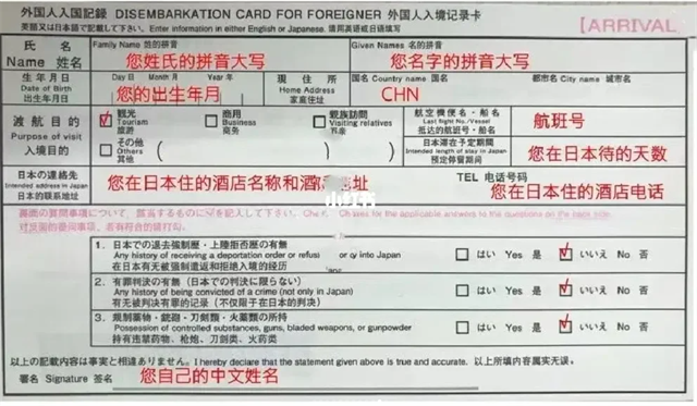 ● 如航班上有派發(fā)(部分航司需要自行找空姐要),建議您在飛機(jī)上填好;如航司沒(méi)有派發(fā),可在入境審查區(qū)領(lǐng)取,請(qǐng)您用英文或日文填寫(xiě)。