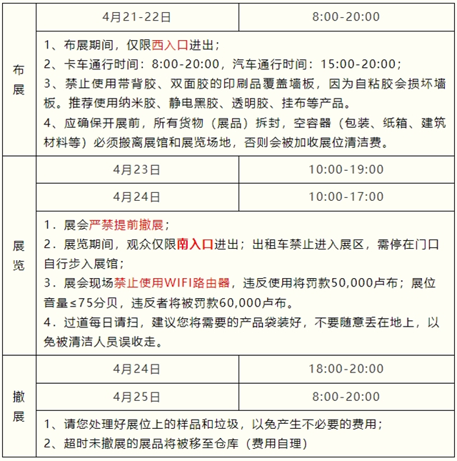 撤展注意:請(qǐng)您處理好展位上的樣品和垃圾,以免產(chǎn)生不必要的費(fèi)用!