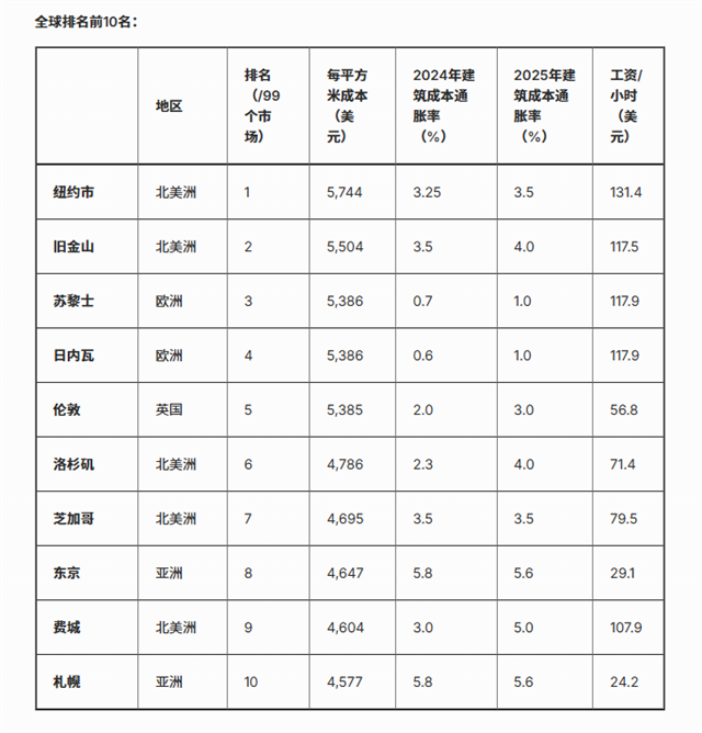 據(jù)全球?qū)I(yè)服務(wù)公司特納?湯森德(Turner & Townsend)《2025 年全球建筑市場(chǎng)情報(bào)報(bào)告》顯示,紐約和舊金山以每平方米 5,744 美元、5,504 美元的建筑成本穩(wěn)居全球最高之列,美國(guó)有 5 座城市躋身全球建設(shè)成本前十。