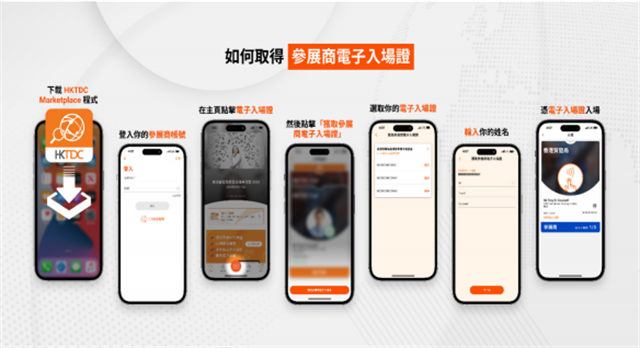 根據香港貿發局的規定,參展商現可在到達會場前通過使用 HKTDC Marketplace App 登入參展商賬號,預先換領所有參展商電子入場證(Exhibitor e-Badge)。請于進館日前(10月12日)安排換領貴司所有參展商電子入場證(Exhibitor e-Badge)。